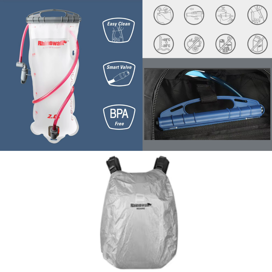 Bolsa de hidratación de 2L que puedes alojar en su compartimento especifico + bolsa para la lluvia en su compartimento inferior.
